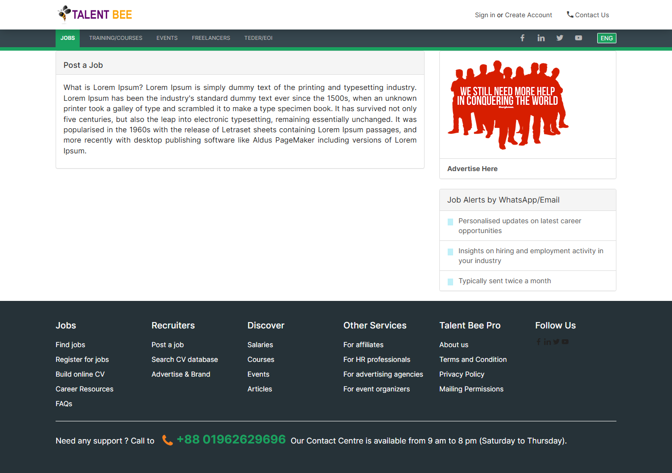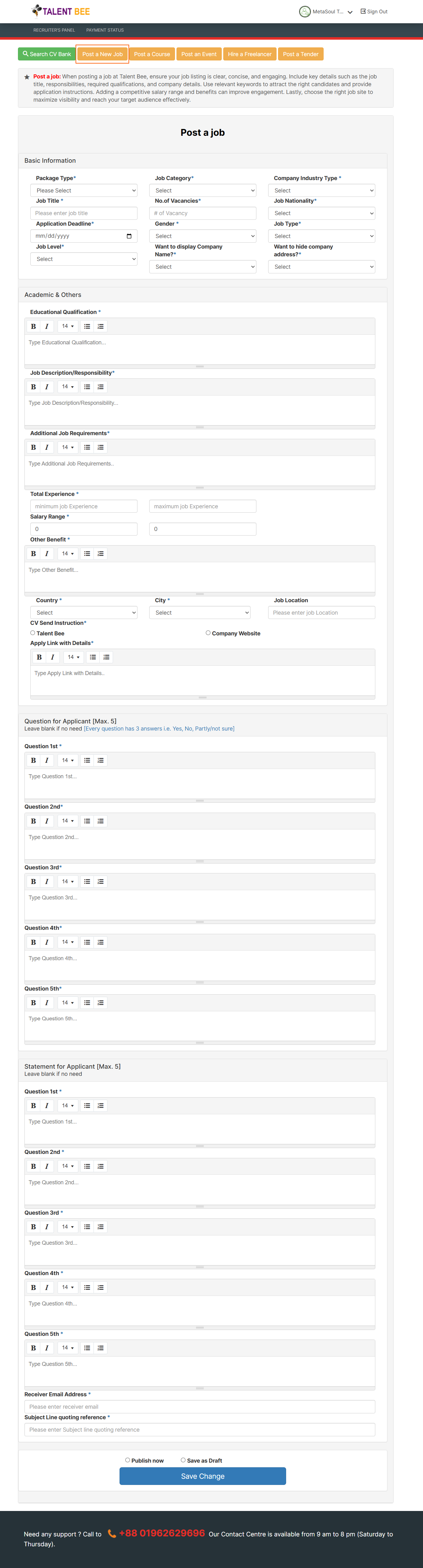 Talent Bee provides a streamlined process for recruiters and employers to post job opportunities on its all-in-one platform. By posting a job on Talent Bee, you gain access to a wide pool of talented individuals actively seeking new opportunities. To post a job, simply create an account, fill in the job details (such as title, description, requirements, and location). Talent Bee ensures your job reaches the right audience, making it easier to connect with qualified candidates. With its user-friendly interface and efficient management tools, Talent Bee simplifies the recruitment process, saving time and effort for both recruiters and job seekers.