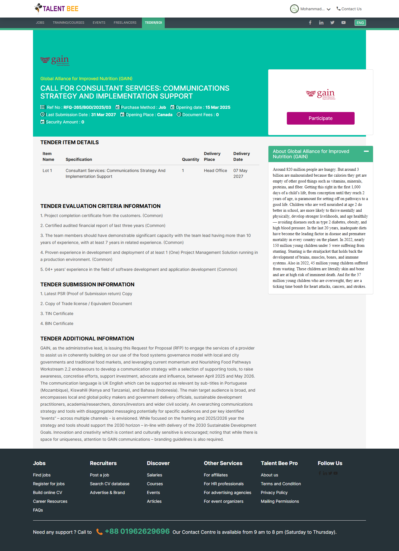 Talent Bee provides a streamlined platform for organizations and businesses to post tenders and connect with qualified vendors or service providers. Whether it's for procurement, construction, or services, Talent Bee ensures your tender reaches a wide audience of potential bidders. To post a tender, create an account, provide detailed information (such as tender title, description, requirements, deadlines, and evaluation criteria). Talent Bee's centralized system ensures your tender gains maximum visibility, helping you attract competitive and reliable bids. With its user-friendly interface and efficient management tools, Talent Bee simplifies the tender posting process, making it easier to find the right partners for your projects or procurement needs.