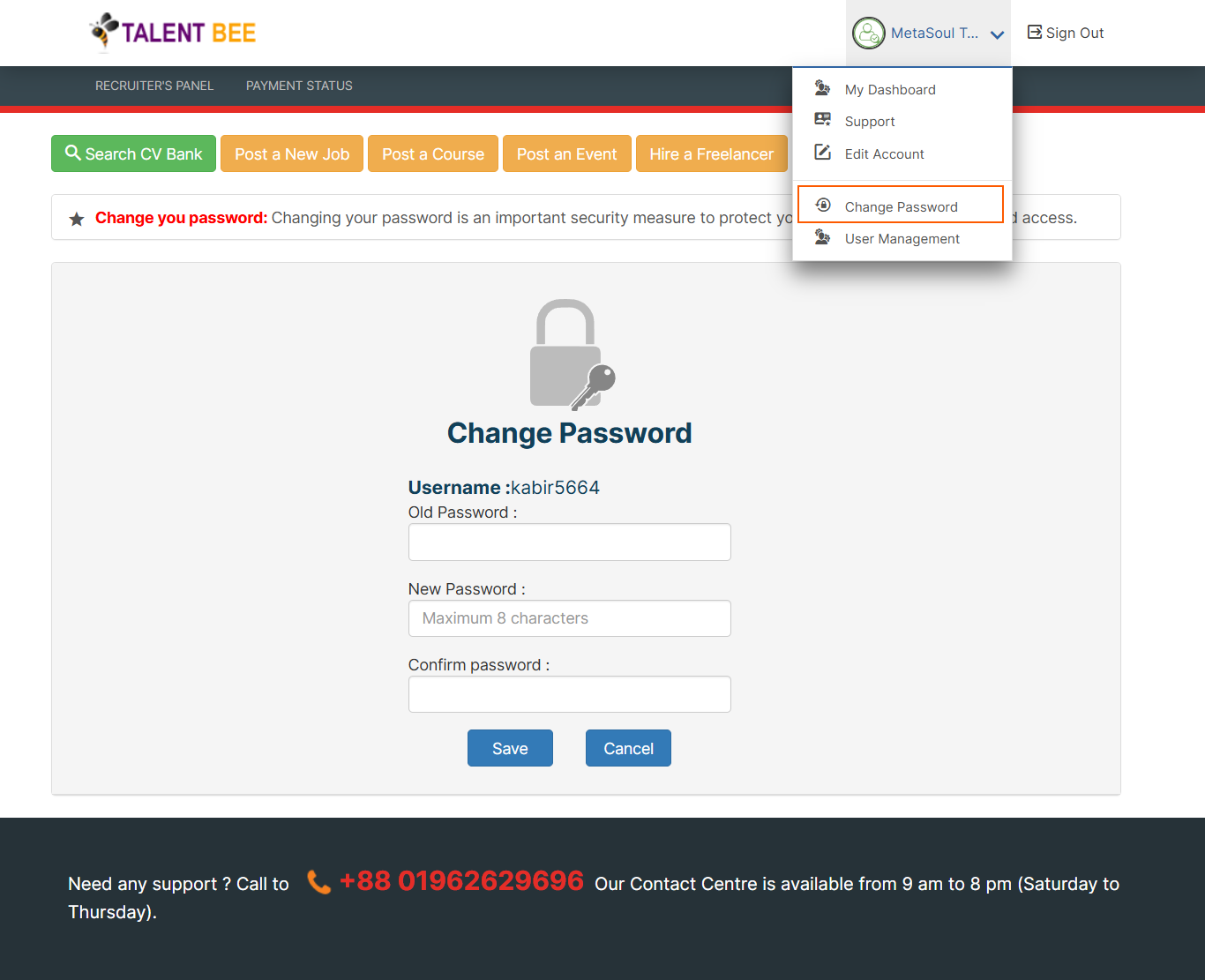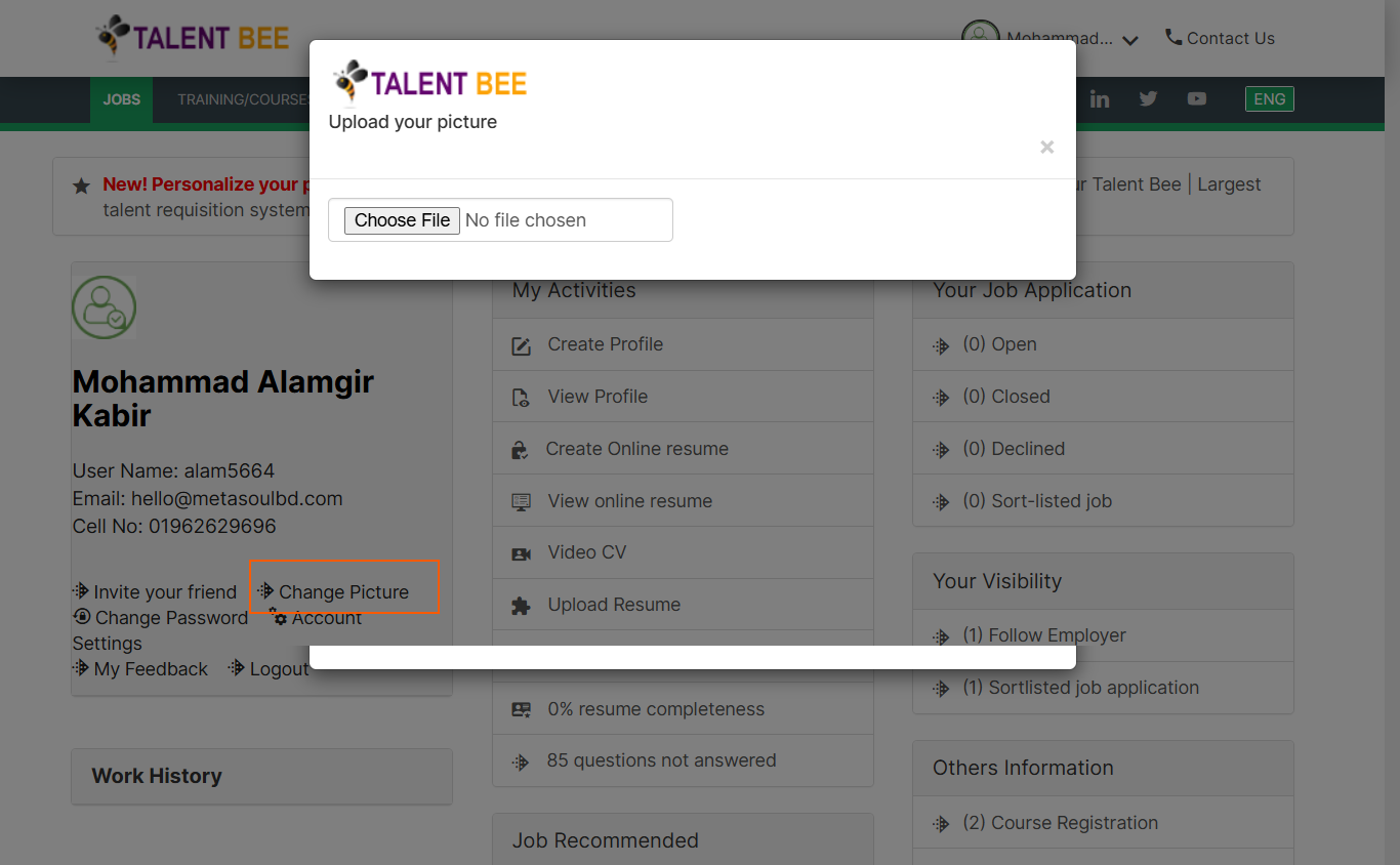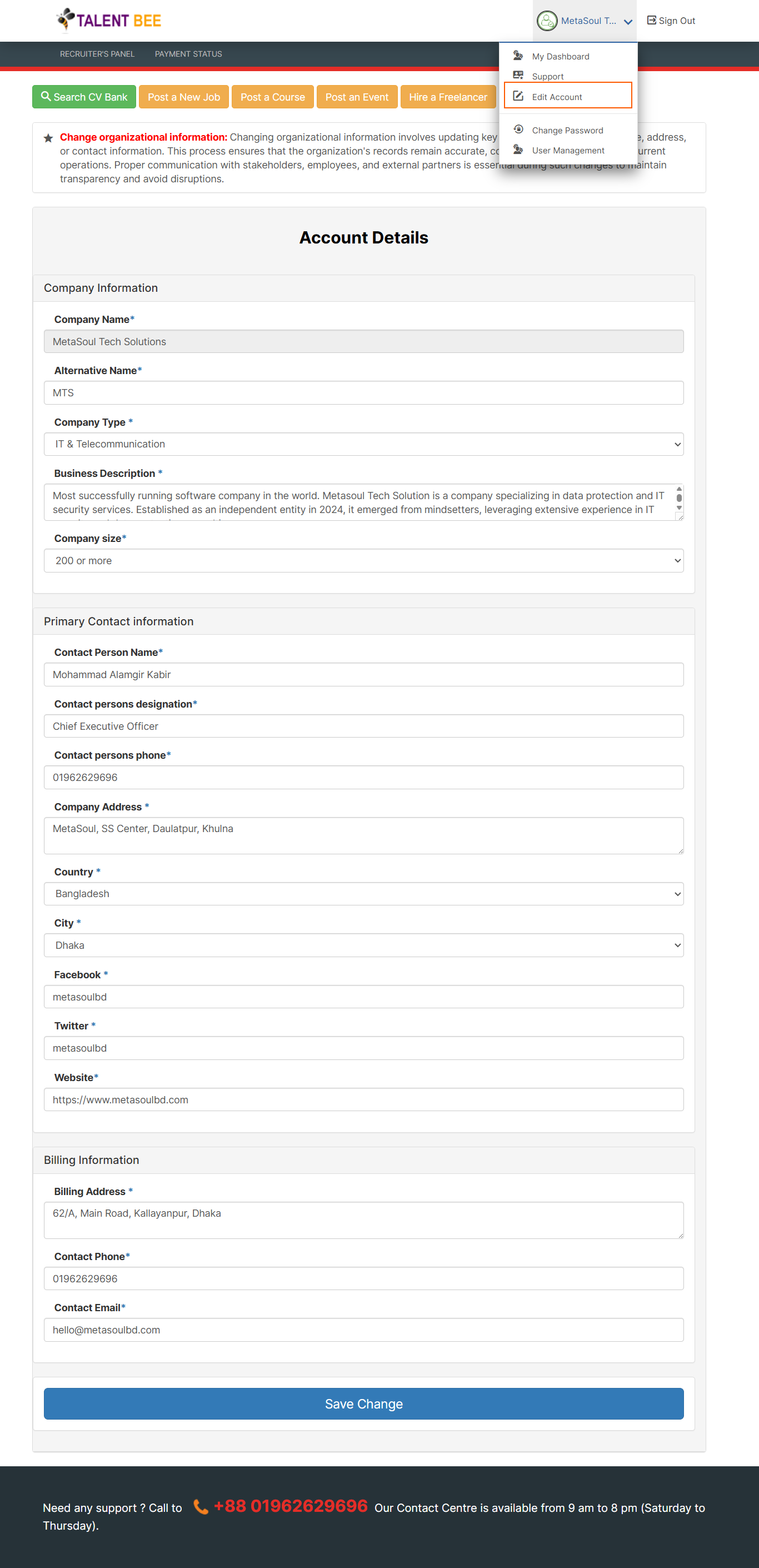 By offering this Edit Account functionality, Talent Bee ensures that users can manage their account information effortlessly, enhancing their overall experience and keeping their profile relevant for all opportunities.