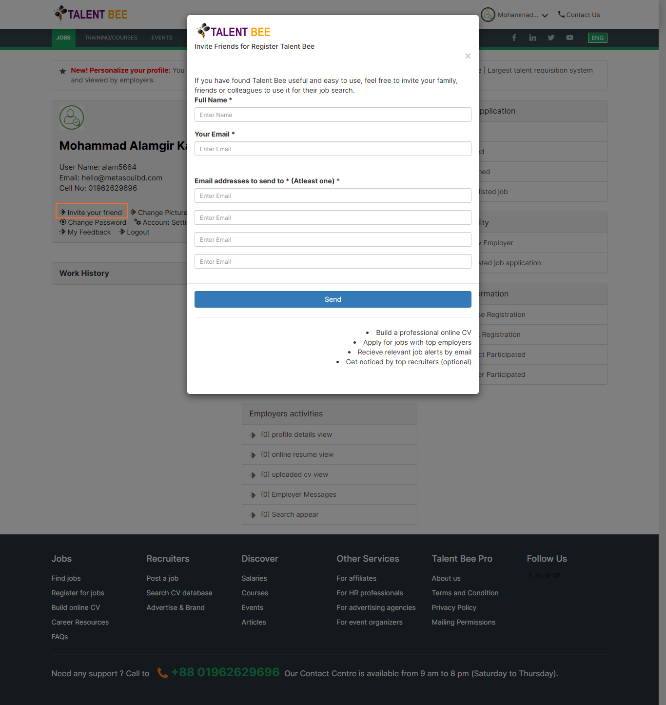 In Talent Bee, "Invite Friends" allows users to refer others to the platform. It helps expand the network, making it easier to connect with potential candidates and collaborators for opportunity. Just click the invite your friend from dashboard. A window open with different information. Fill up the form and press send button.