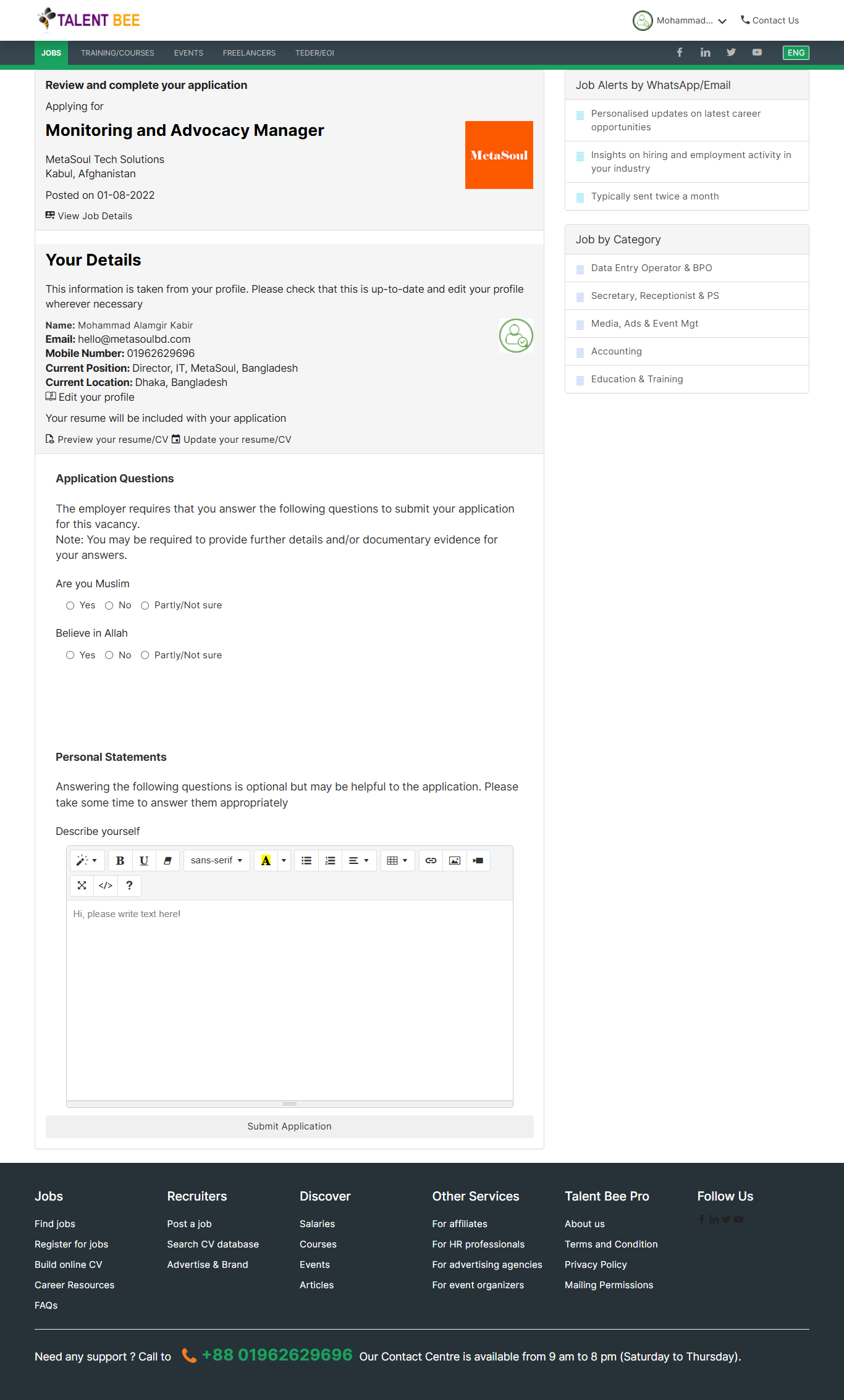 To apply for a job as a seeker on the Talent Bee platform, follow these steps:
