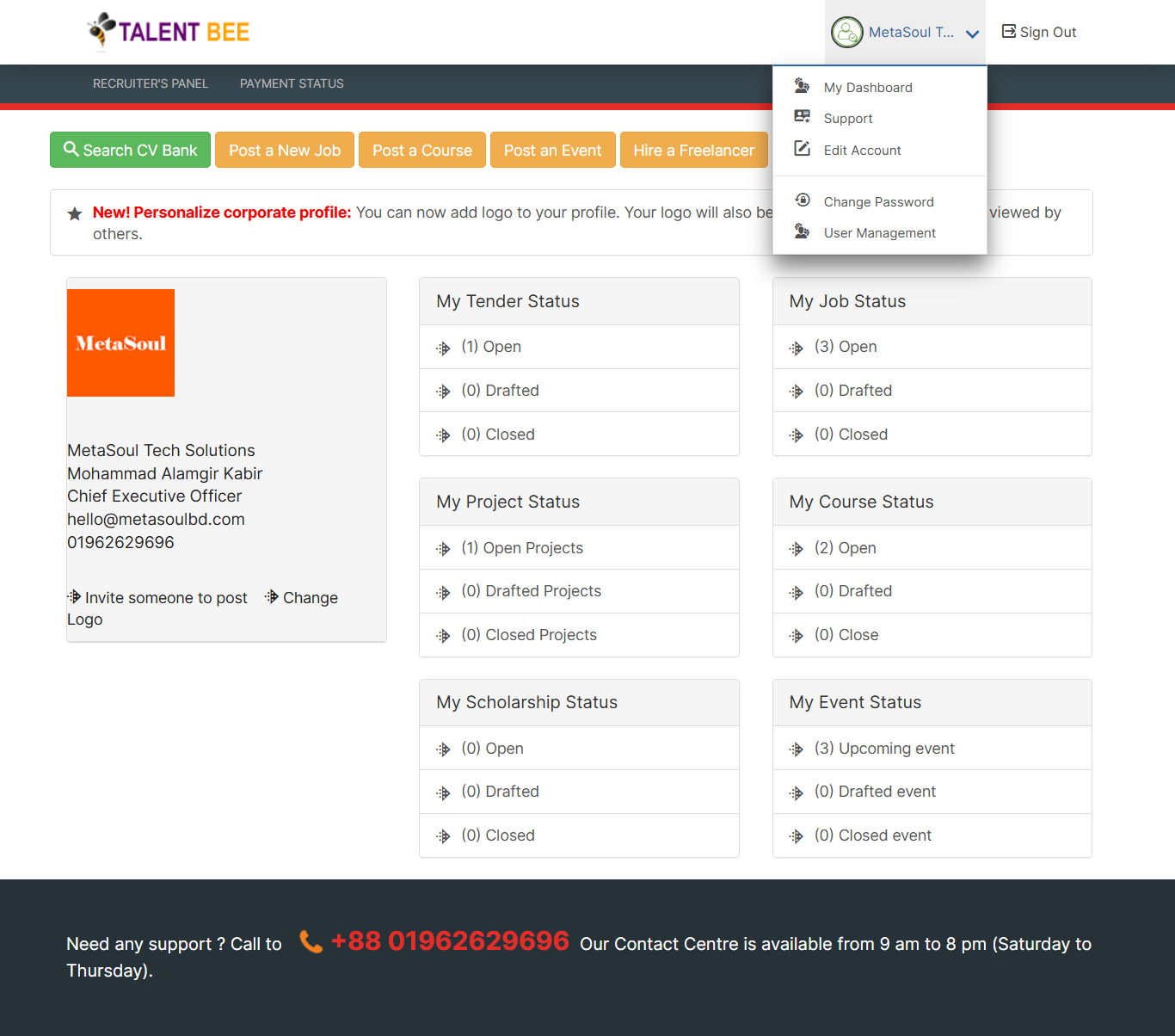 Access to Recruiter Panel: Once registered and set up, recruiters gain access to their dedicated panel, where they can manage and post job openings, courses, events, tenders, and projects.