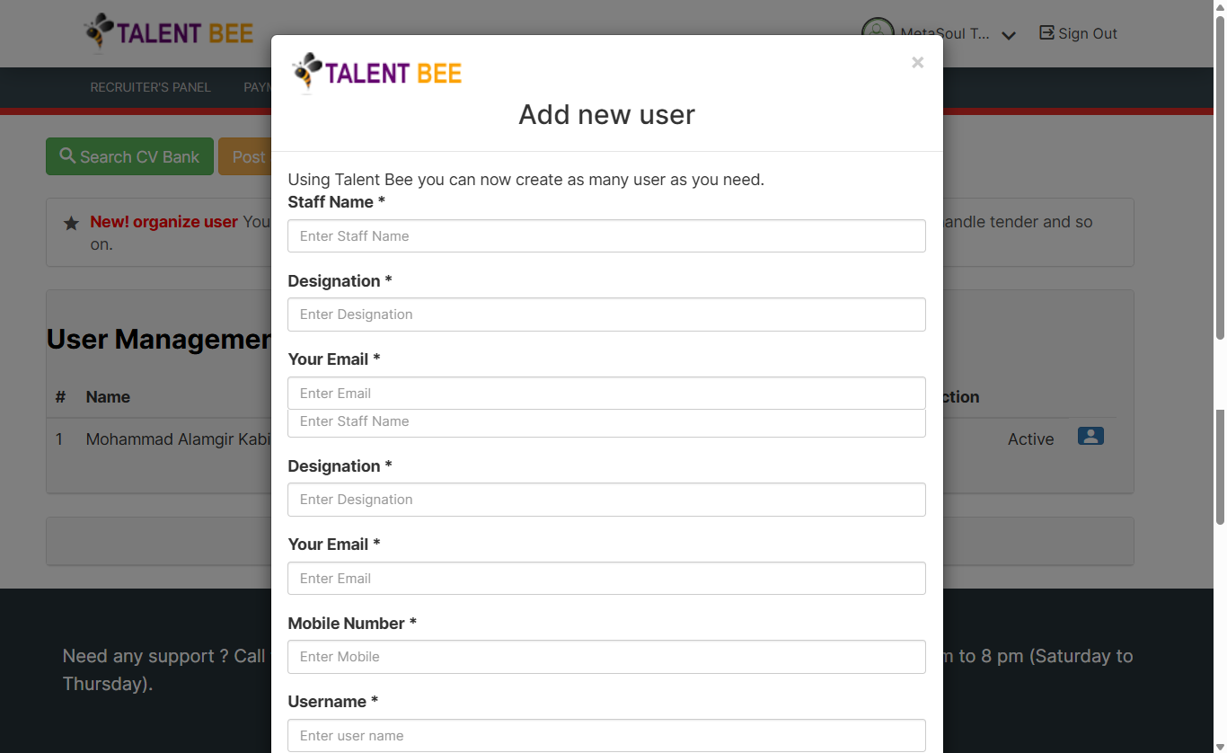 In Talent Bee, the Recruiter Panel offers recruiters the ability to manage multiple user accounts with different credentials, allowing them to delegate tasks and responsibilities efficiently across their team or organization. This feature is especially beneficial for larger teams, enabling recruiters to assign specific roles to different users based on their responsibilities, such as managing job listings, events, tenders, or projects.