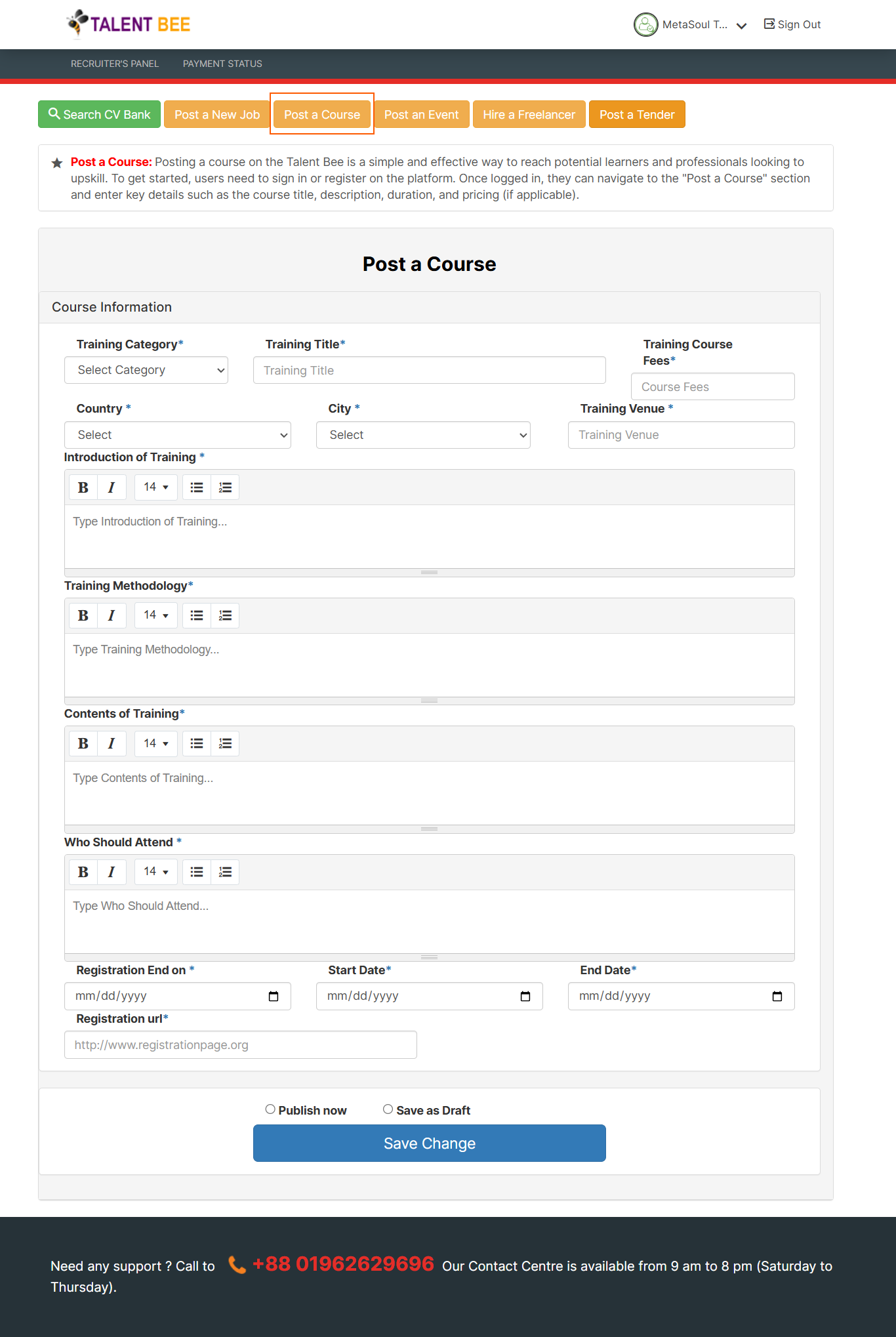 Talent Bee offers an easy and efficient way for educators, trainers, and institutions to post courses on its all-in-one platform. By listing your course on Talent Bee, you can reach a diverse audience of learners actively seeking to enhance their skills and knowledge. To post a course, create an account, provide detailed information (such as course title, description, duration, fees, and learning outcomes). Talent Bee ensures your course gains visibility among the right audience, helping you attract interested participants. With its centralized management tools and user-friendly interface, Talent Bee simplifies the process of connecting course providers with eager learners, fostering growth and development for all.