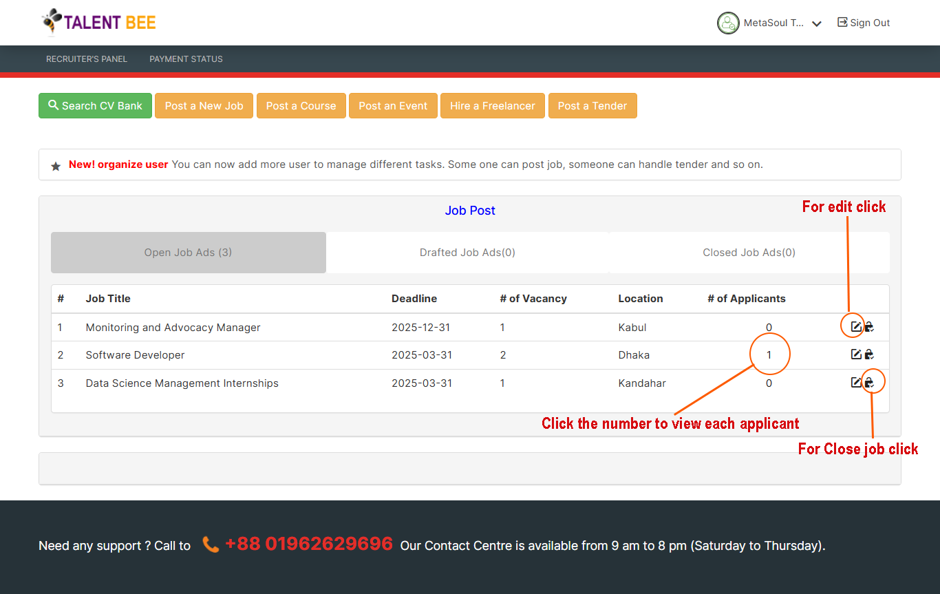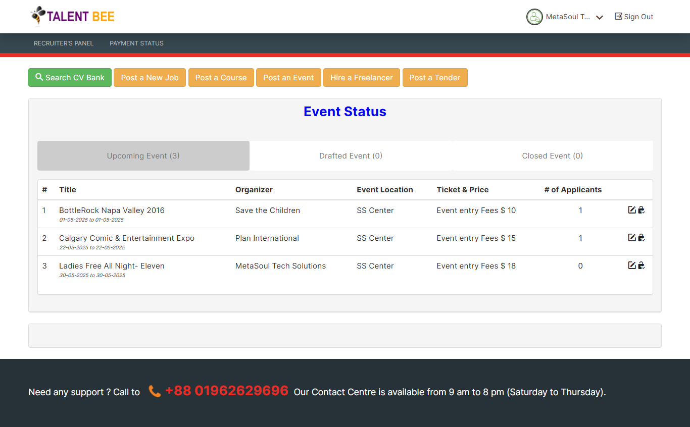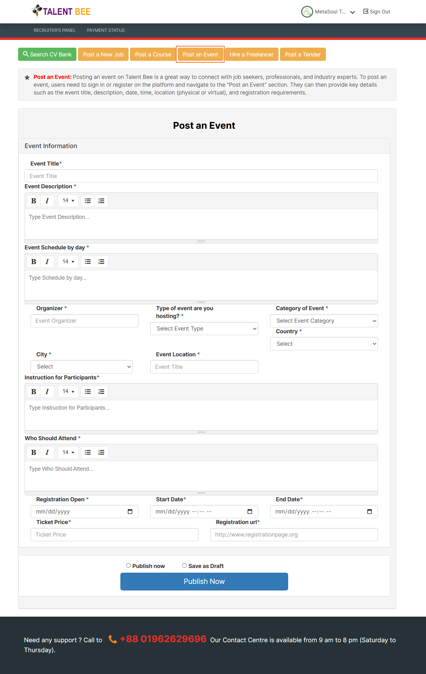 The Recruiter Panel on Talent Bee is a comprehensive tool designed for employers, recruiters, and event organizers to efficiently manage and post various opportunities. It allows recruiters to: