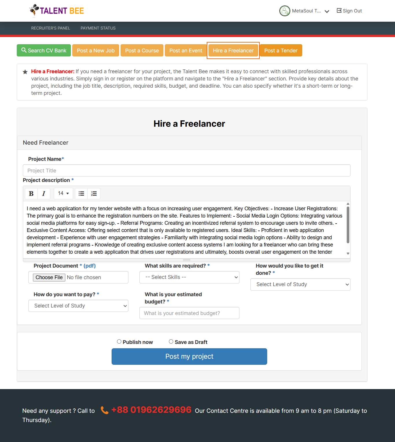 Talent Bee offers a seamless solution for businesses and individuals to post projects and connect with skilled freelancers or professionals. Whether it’s a short-term task or a long-term initiative, Talent Bee helps you find the right talent to bring your project to life. To post a project, create an account, provide detailed information (such as project title, description, budget, timeline, and required skills). With its centralized management tools and user-friendly interface, Talent Bee simplifies the process of connecting project providers with skilled professionals, ensuring efficient collaboration and successful project outcomes.